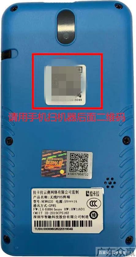 拿到一台未注册开通的机器后,打开盒子取出机器,如图所示,每一天机器背面都有一个二维码,此二维码是一机一码的。我们用支付宝或者微信扫描二维码进行注册(事先准备好身份证和绑定的银行卡)