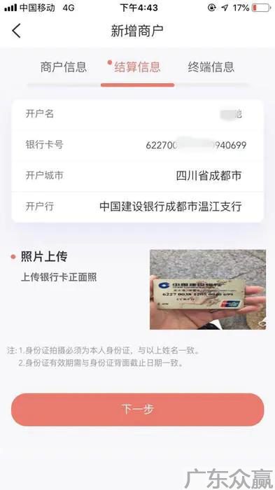 3.第三步是绑定注册人的收款银行卡。(绑定银行卡规定:必须是注册人本人的银联借记卡),上传照片后下一步。