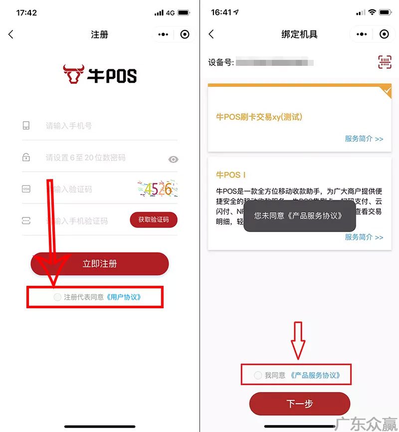填写手机号注册牛POS账号时,注意勾选界面中的“注册代表同意《用户协议》”;此外,在进行补充资料认证,扫描牛POS机具背面的SN号后,需详细阅读并勾选“我同意《产品服务协议》”。