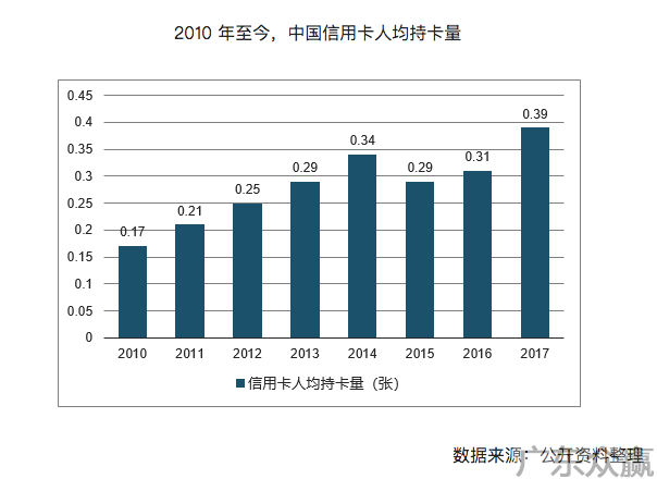 结合10年到17年的数据我们能看出,不管是信用卡的人均持卡量,还是发卡量,总体上还是呈现增长的趋势。