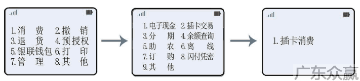 收银员选择“1.消费”并输入金额后即可请持卡人挥卡或挥手机,具体操作步骤如下:
