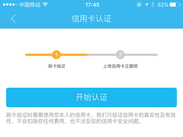 6、提交后会提示信用卡认证,点击开始认证,输入信用卡相关信息,拍照提交。