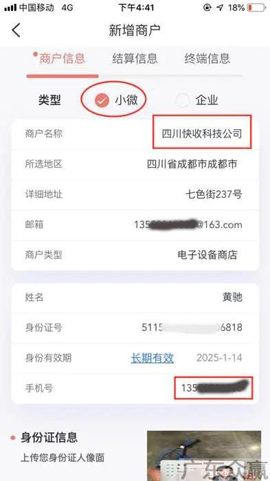 2.手机会弹出填写资料界面,“小微”和“企业”应该怎么选?如果您是个人使用或者没有营业执照的商家请选择“小微”;如果有营业执照请选择“企业”(二者的区别我们在前文已经讲过,唯一的区别在于收款额度,详见拉卡拉放宽“小微商户入网”的意义里面有具体的区别!)。其他信息请填写注册人真实的信息(比如上面是留的我的信息),并上传证件照!点击下一步。