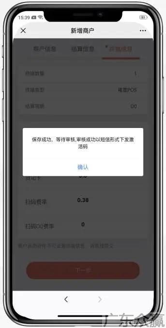 5.提交以后,系统会显示等待审核,正常情况下只要信息填写正确,1-2分钟即可审核通过,通过后,会给我们注册时留的手机号发送一个激活码。此步骤和以前的拉卡拉POS机一样的激活方式。收到激活码后,我们需要把机器开机(签到:操作员01,密码0000),输入激活码即可完成开通!