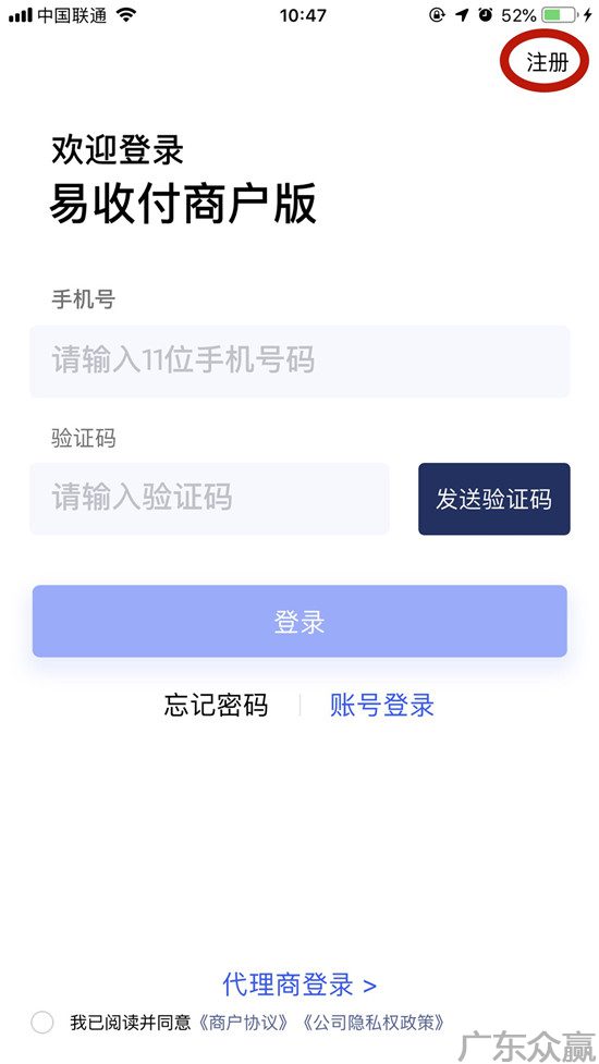 2.打开乐刷“易收付”APP,点击右上角的“注册”