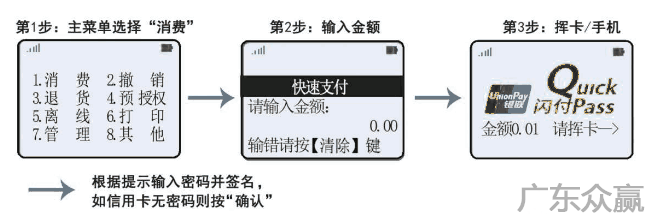 收银员选择“1.消费”并输入金额后即可请持卡人挥卡或挥手机,具体操作步骤如下: