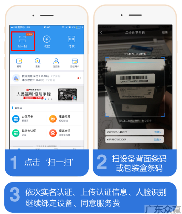第二步:手机号注册后进入主界面,点击银盛通左上角扫一扫(扫机子背面的条形码或盒子上长长的条形码、扫机子背面的条形码时,可以用手挡住其他的码,可以扫久一些识别出来),