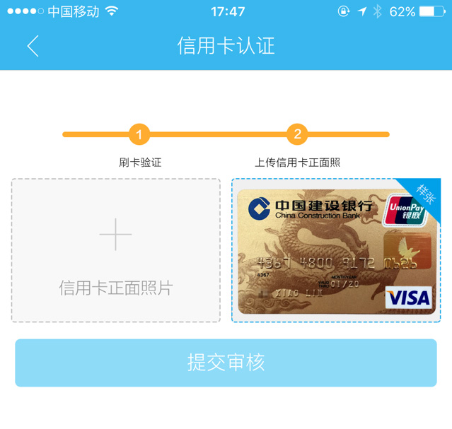 信用卡信息填写完后,提交审核!审核通过后会有短信提示!(认证两张信用卡是最高星级,可提升刷卡额度)
