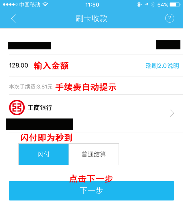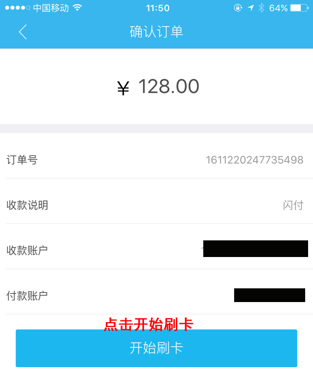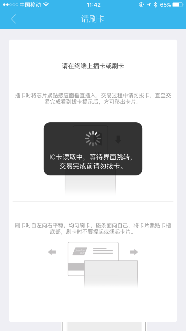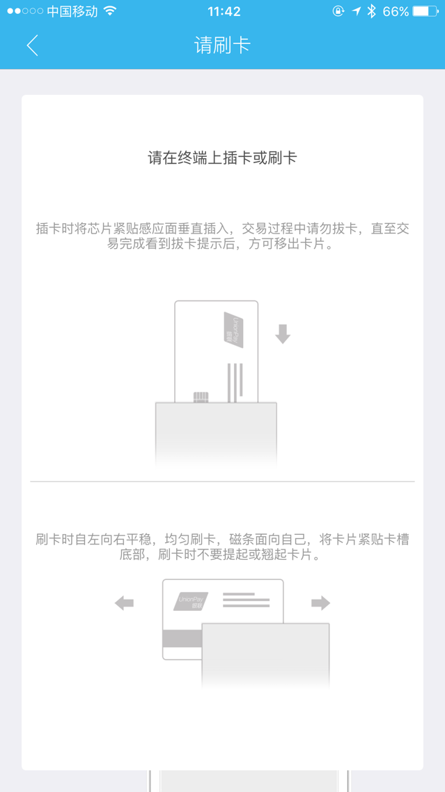 出现下面这个图即使蓝牙链接成功,开始刷卡,芯片卡直接插到卡槽里,磁条卡直接刷((面对机子正面,磁条朝外朝下))